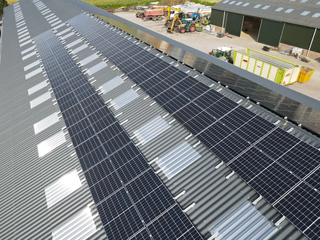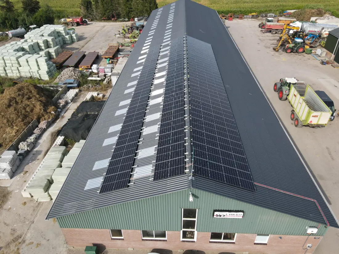 Bij dit project in Stoutenburg hebben we 152 LONGi Solar panelen geïnstalleerd. Deze panelen van 410Wp zijn aangesloten op een 40 KTL omvormer van het merk Huawei. Deze panelen zijn bevestigd op een Van der Valk montagesysteem.